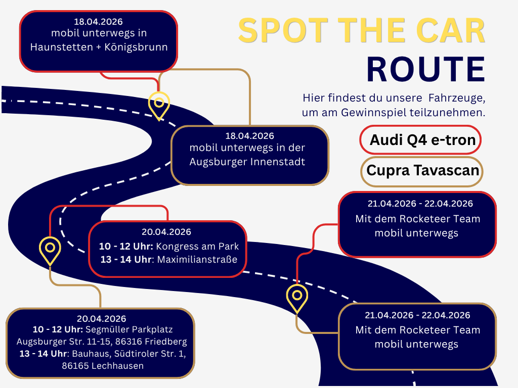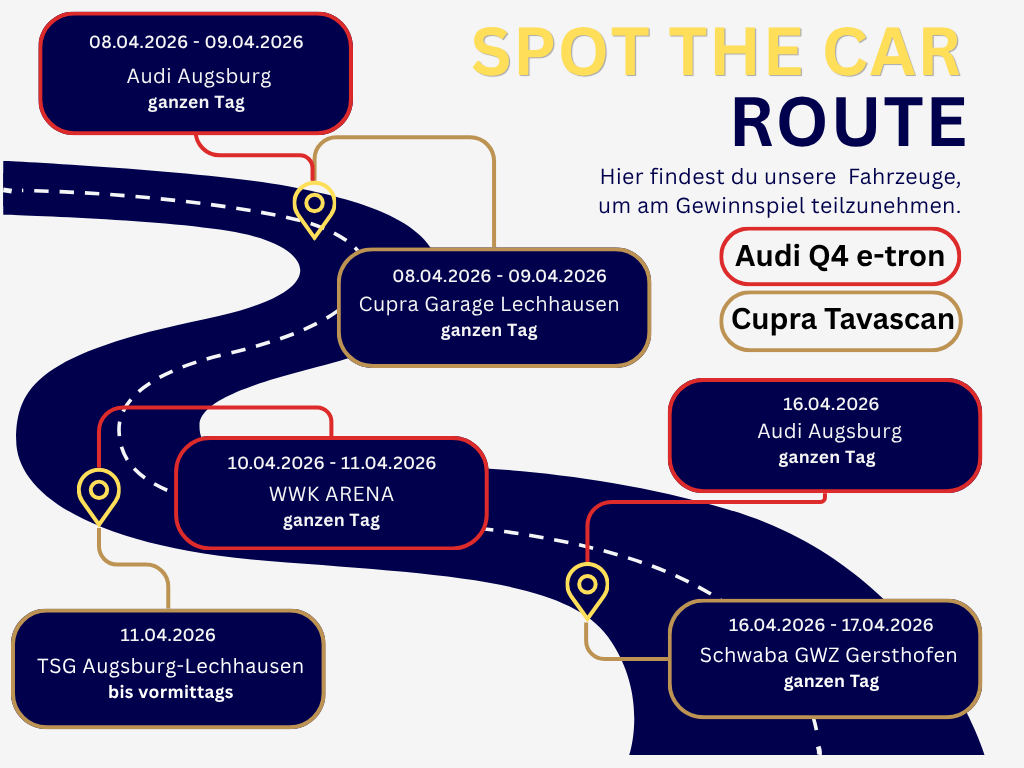 Während des gesamten Kampagnenzeitraums ist das gebrandete Fahrzeug an wechselnden Standorten in und um Augsburg unterwegs. Jede Woche erwarten dich neue Spots und damit neue Gewinnchancen.