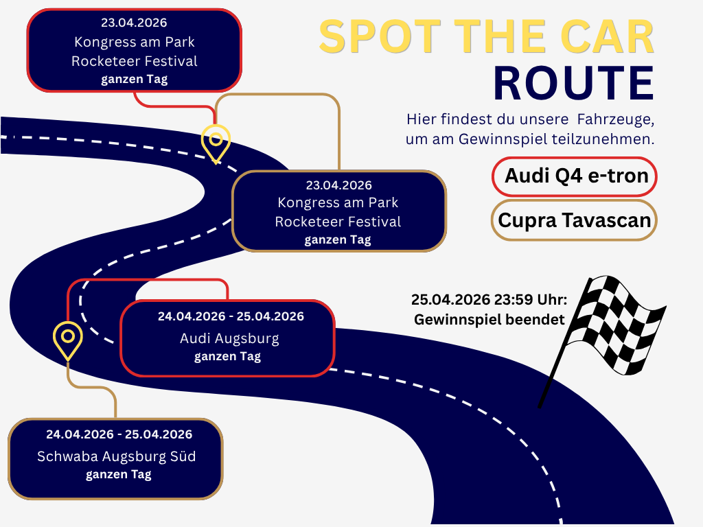 Während des Kampagnenzeitraums sind zwei auffällig gebrandete Fahrzeuge unterwegs: der Audi Q4 e-tron und der Cupra Tavascan. Wer eines davon entdeckt und korrekt kommentiert, hat die Chance auf einen Gewinn.